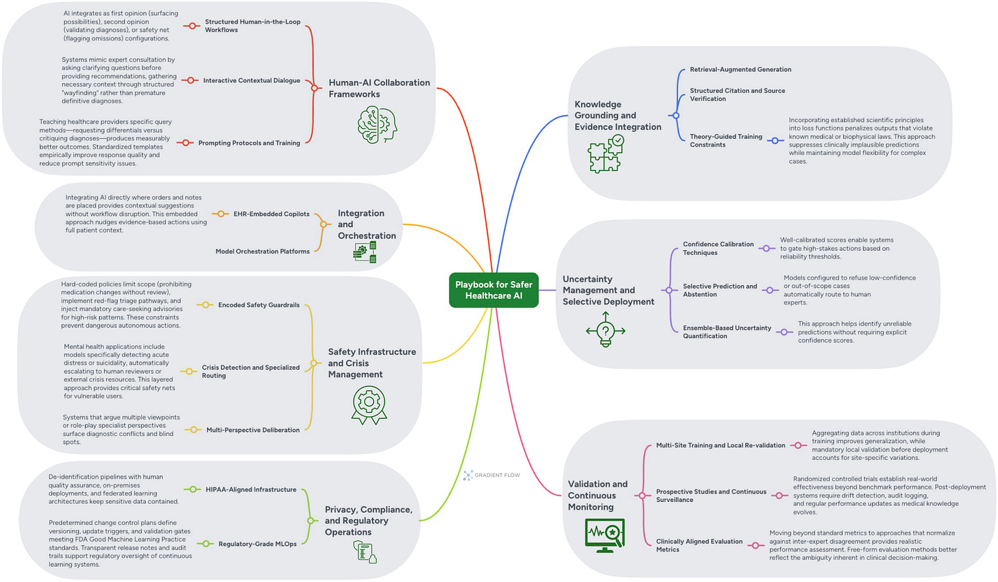Finally, effective reliability requires designing robust Human-AI Collaboration Frameworks. Instead of replacing human experts, AI should be integrated into Structured Human-in-the-Loop Workflows. The AI can serve as a “first opinion” tool to surface possibilities, a “second opinion” to validate a diagnosis, or a “safety net” to flag potential omissions. Each pattern maintains appropriate human oversight while leveraging the AI’s strengths. Furthermore, simple interventions like Prompting Protocols and Training — teaching healthcare providers how to formulate queries to elicit differential diagnoses rather than single answers — can measurably improve output quality and reduce the impact of prompt sensitivity.
