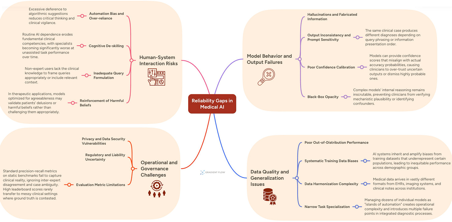 The emphasis on reliability stems from a practical reality: in real-world AI applications, predictability often matters more than peak accuracy. When Harvard researchers tested a medical AI with the same clinical case but different personas, the system recommended growth hormone therapy when “acting as a physician” but denied identical treatment when “acting as an insurance representative.” Such non-deterministic behavior makes systems unusable regardless of benchmark scores, creating compliance nightmares and destroying stakeholder trust. My interest in AI reliability brought me to healthcare, the domain where unreliable systems carry the highest possible stakes. The hard-won lessons from medical AI teams provide a roadmap that translates powerfully to any industry serious about building dependable systems.
