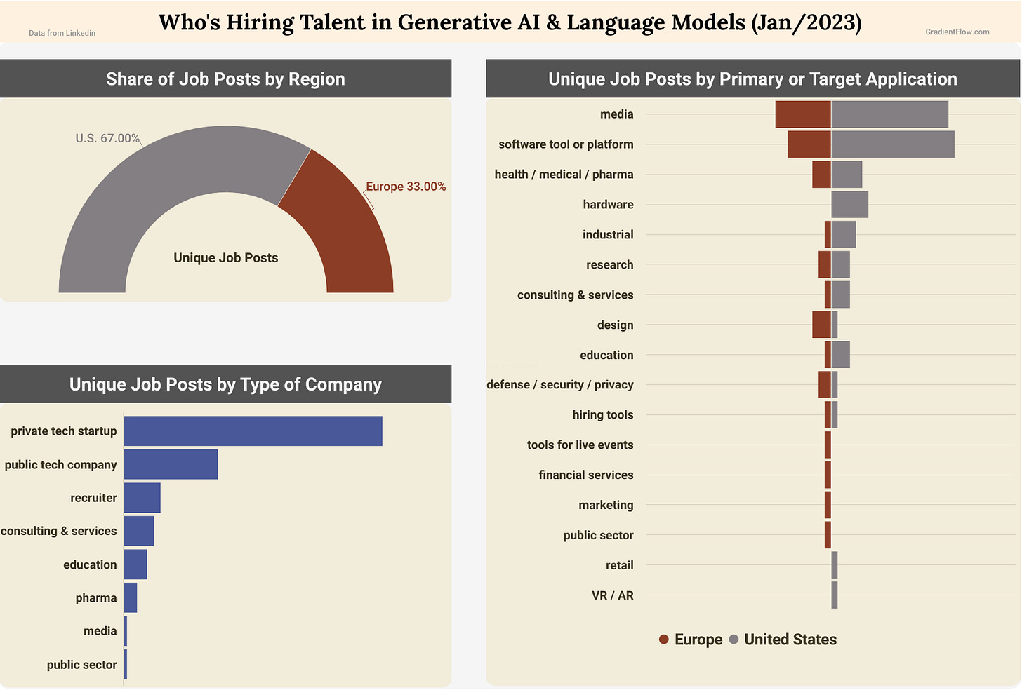 [Recent job listings in the U.S. & Europe that mention Generative AI or Language Models reveal that adoption of these technologies remains in its nascent stages. Tech firms continue to dominate the job market, with a focus on the development of software tools and media applications utilizing these technologies. Click to enlarge.]
