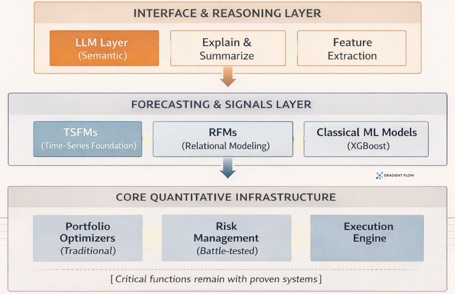 Rather than displacing incumbent quantitative infrastructure, modern AI is increasingly integrated as a reasoning and interface layer on top of established engines. In these hybrid stacks, LLMs handle semantic tasks — summarizing research, proposing signals, and explaining portfolio composition — while TSFMs and RFMs generate forecasts. However, critical functions such as allocation, risk management, and execution remain the domain of traditional optimizers and models. LLMs are often utilized “offline” to extract features from unstructured text, which are then fed into robust, lightweight classical models (such as XGBoost) for final prediction.