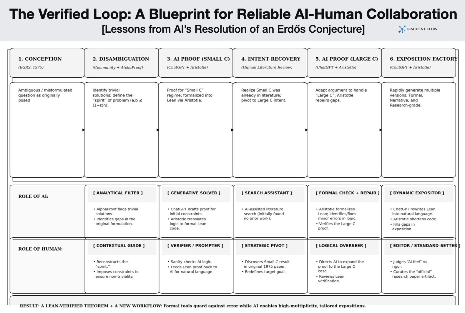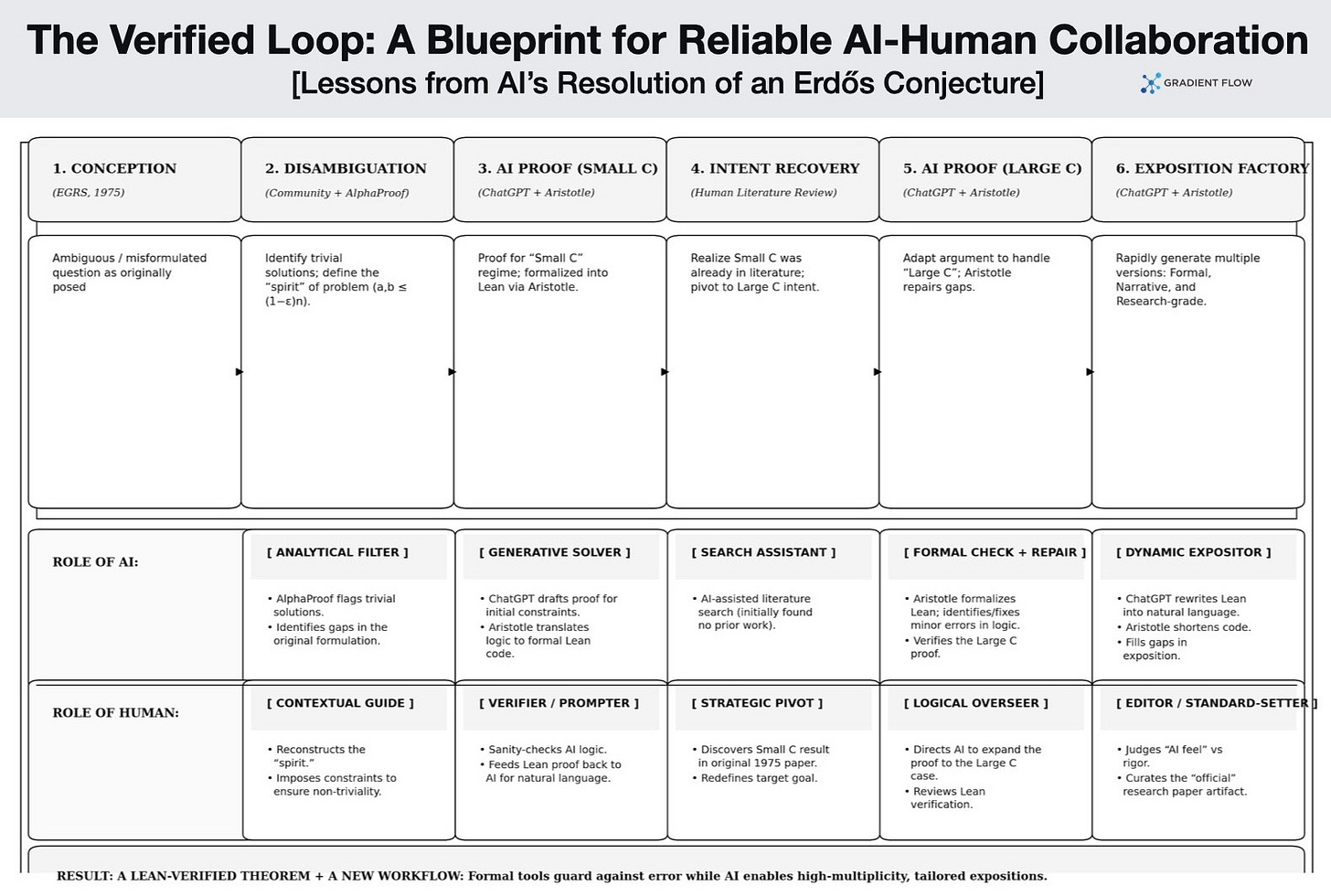 This recent example from the world of mathematics caught my attention as an example of a “verified” AI pipeline. The workflow shows how to turn an ambiguous goal into a checked result: an LLM proposes a solution, a formal verifier (proof assistant) checks it, and the loop repeats until it passes. Once the core artifact is verified, you can reliably generate multiple explanations — technical, narrative, or research-style — grounded in the same source.