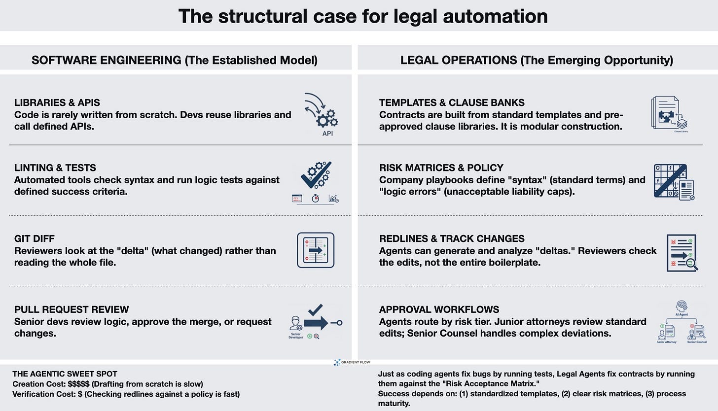 Legal operations quietly built the exact same building blocks that make software automation possible. Contracts are built from templates and clause libraries. Redlines are standard, and changes are easy to compare, much like code diffs. Many companies already operate with standard fallback terms, risk acceptance matrices, and approval workflows. This is basically a template-plus-rules setup that agents can navigate.