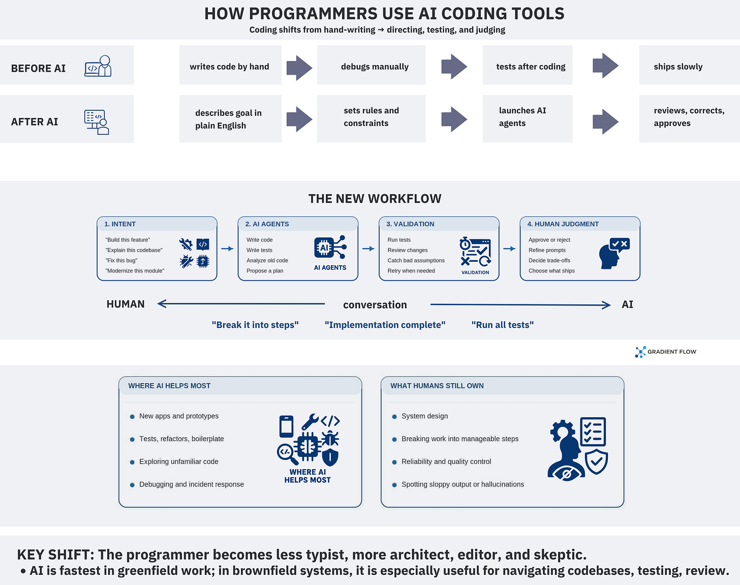 Coding, accounting, and contract operations share a pattern that shows up in more places than we might like to admit. When a job has clear inputs, explicit constraints, and cheap ways to verify results, agents take over the mechanical steps while humans shift toward review, prioritization, and exception handling. The organizations getting real leverage are not the ones writing the cleverest prompts. They are the teams treating agents like a production system by writing crisp specifications, forcing clarity up front, and making it easy to verify outputs before they hit a codebase, a financial ledger, or a contract repository.