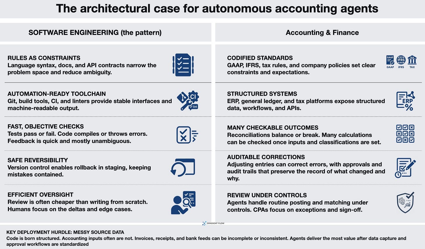 Accounting shares many of the structural advantages that make programming agent-friendly. The work operates under explicit, codified standards and policies that act like shared constraints. GAAP, IFRS, and tax codes define how transactions should be treated and recorded. Tasks decompose naturally into discrete, well-scoped subtasks with clear inputs and outputs. Reconciling an account, calculating depreciation, classifying a transaction, or preparing a tax schedule each have defined parameters and specific rules to follow.