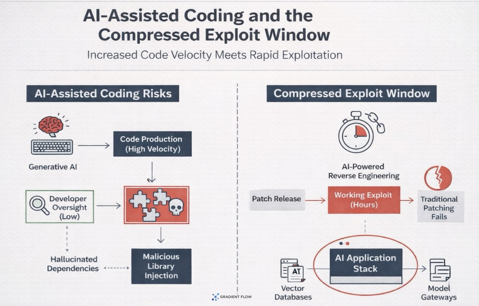 The use of generative AI in software development is significantly increasing the velocity of code production, but it is also introducing new vulnerabilities. Developers often accept AI-generated code without a deep understanding of its logic, risking the inclusion of “hallucinated” dependencies — references to non-existent software libraries that attackers can later create and populate with malware. Simultaneously, AI is enabling attackers to reverse-engineer security patches and develop working exploits in a matter of hours. This “compressed exploit window” means that traditional, periodic patching schedules are no longer sufficient to protect AI application stacks, which rely on rapidly evolving components like vector databases and model gateways that still lack the mature patching ecosystems of legacy software.