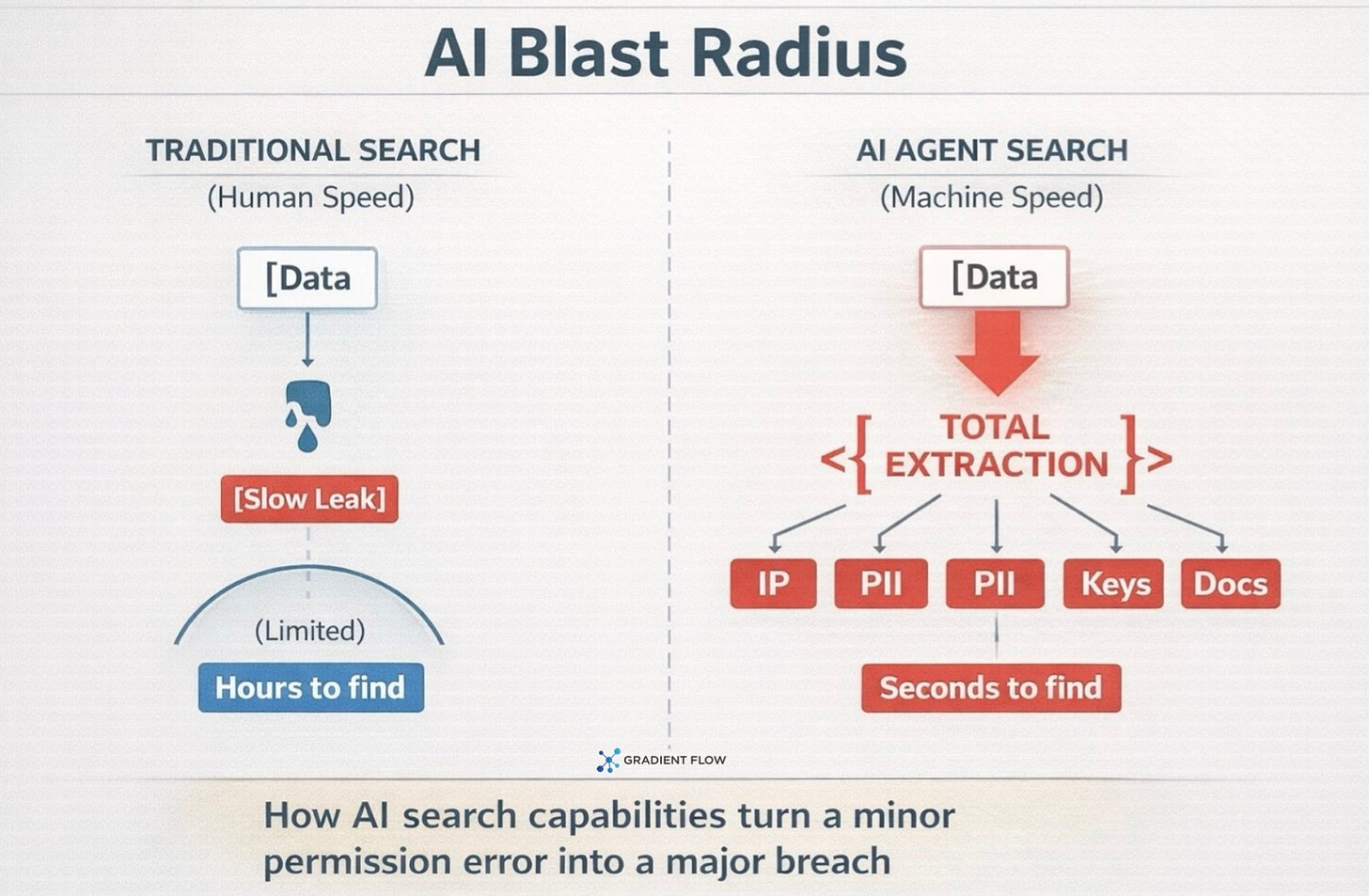 This external exposure is compounded by internal “data sprawl.” Because AI agents can search, summarize, and traverse documents orders of magnitude faster than humans, any misconfiguration in an agent’s permissions creates a massive “blast radius.” The scale of this risk is quantified by the permission gap: while human employees are typically over-permissioned by 70%, AI identities often see rates as high as 90%. While a human might never discover their latent access to a sensitive database, an autonomous agent possesses the computational capacity to systematically explore every “nook and cranny” of its environment. What was once “security by obscurity” is now a liability, as a minor configuration error can be turned into a rapid, comprehensive data exfiltration event at machine speed.
