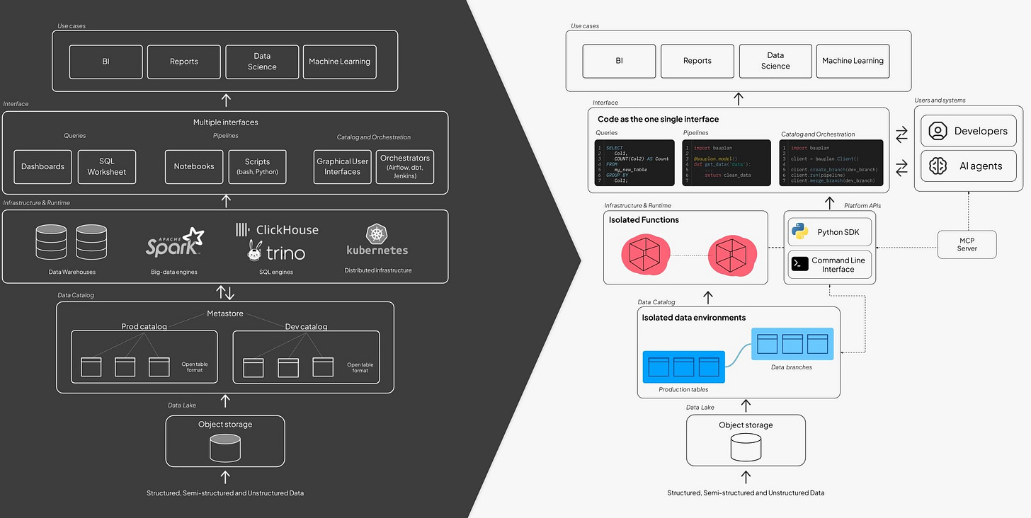 New platforms like Bauplan extend this idea to the data plane. Every run produces an immutable commit linking code, data, and environment. Agents can branch, test, and merge using the Write-Audit-Publish model — a safety net for autonomous operations.