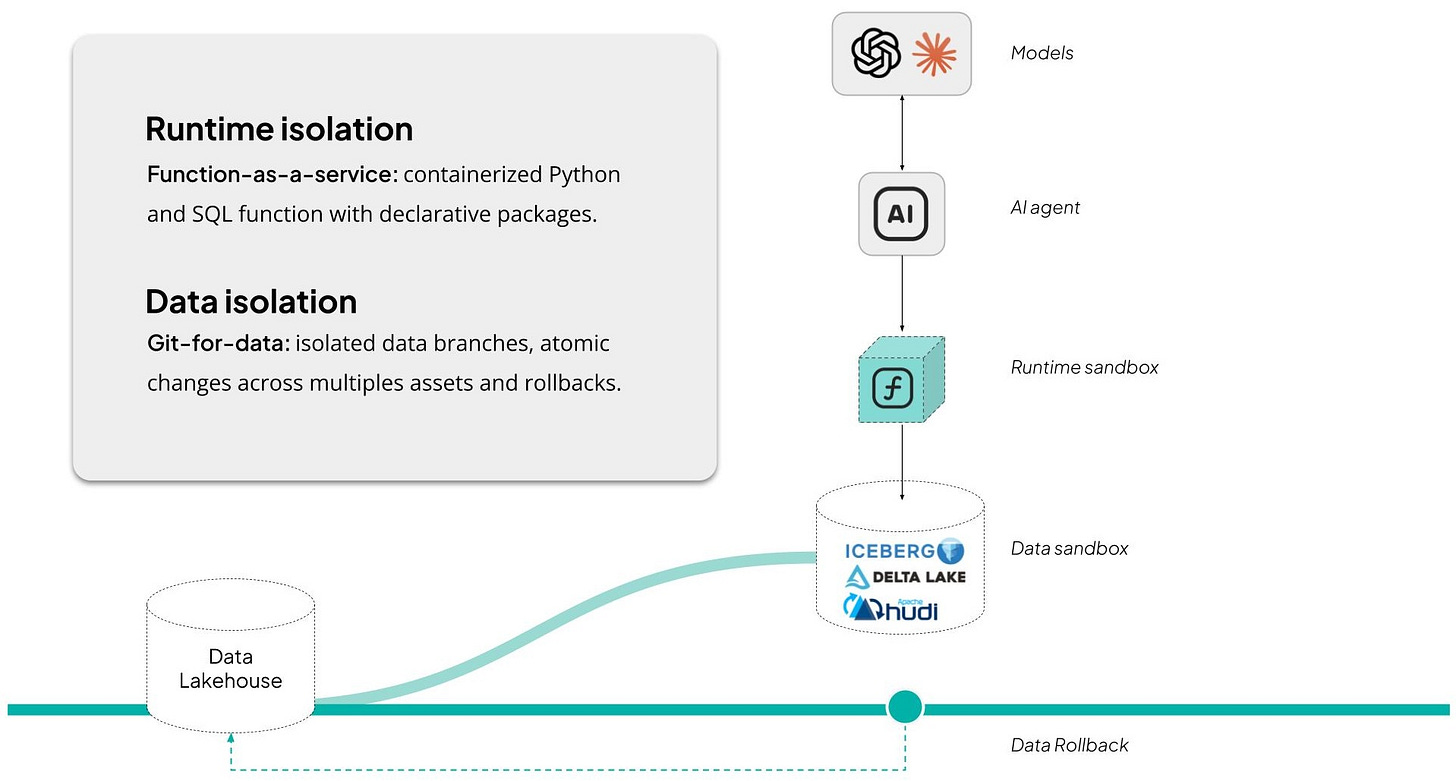 This approach is what modern lakehouse architectures enable. By combining object storage with versioned table formats (Iceberg, Delta Lake), teams gain atomic commits, full lineage, and instant rollback. Databricks and Snowflake have proven that open tables on object storage can support enterprise-scale workloads. But what’s still missing in most stacks is runtime isolation and composable APIs — the last mile required to make those systems safe for autonomous agents.