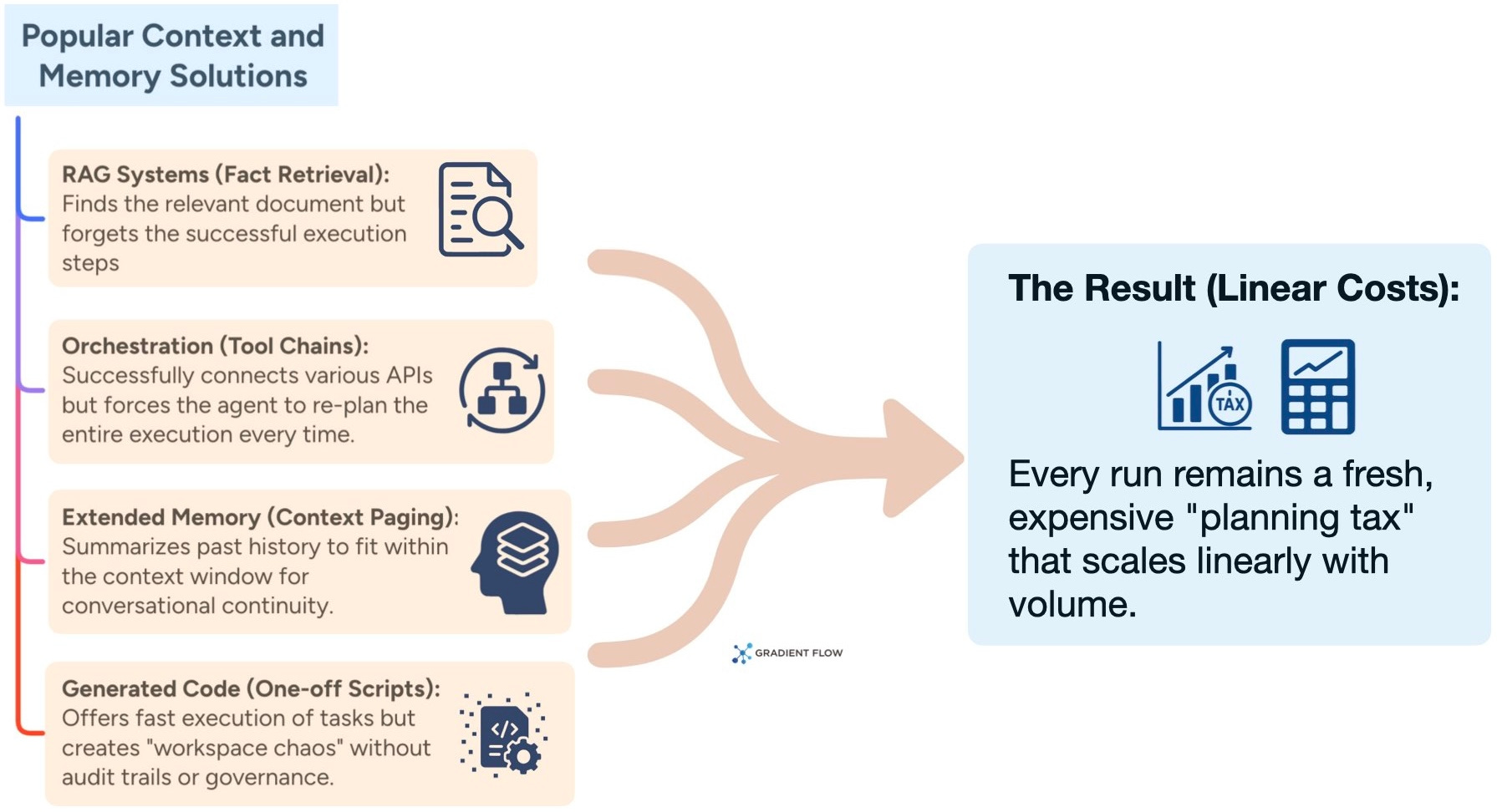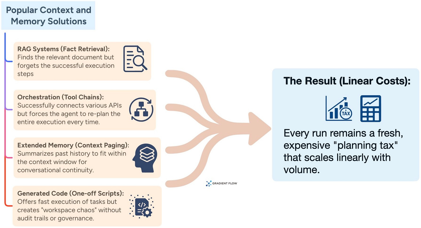 In the end, current memory methods force agents to remain in a state of perpetual improvisation. Because there is no way to “crystallize” a successful solution into a reusable procedure, the organization never develops an institutional learning curve. To really scale in an enterprise, agents need to stop just managing what is in their immediate context and start building a permanent library of proven procedures. This transforms one-off successes into reliable, repeatable assets.