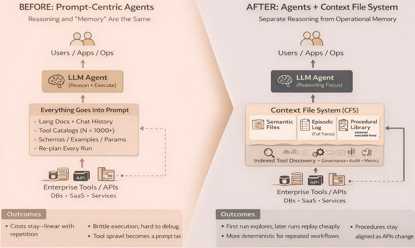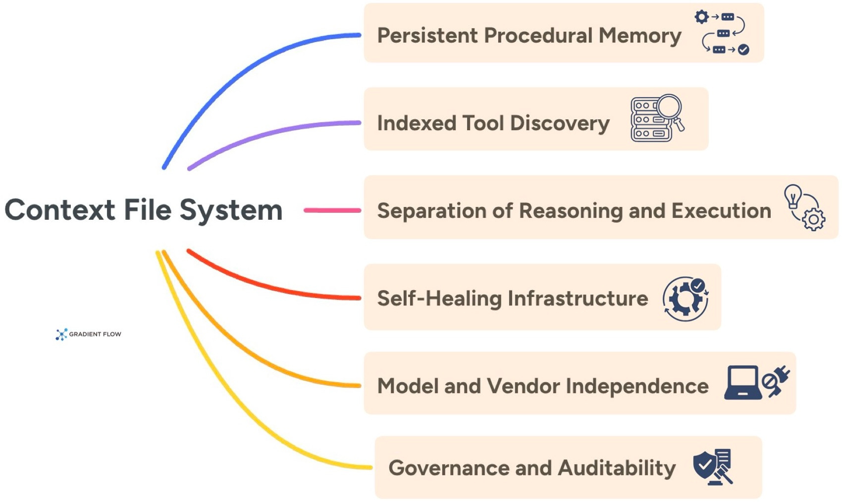 To fix these structural bottlenecks, we are seeing the rise of what dex calls a Context File System (CFS). You might also hear this more broadly categorized as an Operational Skill Store. This architecture separates the expensive reasoning of a large language model from the actual storage of operational knowledge. It mirrors the way a mature engineering team works. Senior staff solve a novel problem once and then document the solution in a runbook so the task becomes routine. By turning successful executions into permanent and reusable procedures, a CFS transforms agents from improvisational tools into reliable enterprise infrastructure.