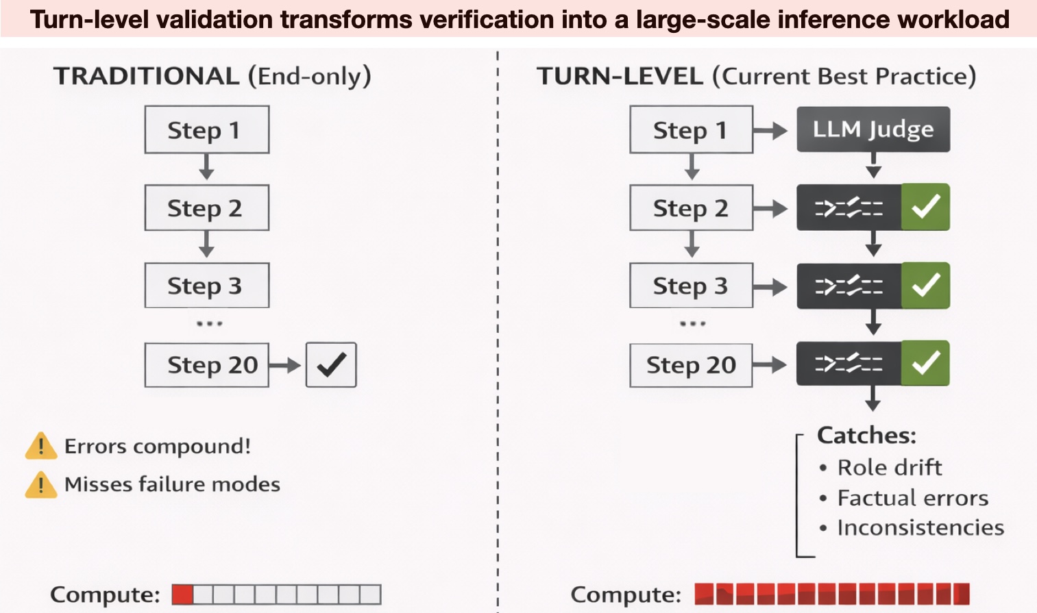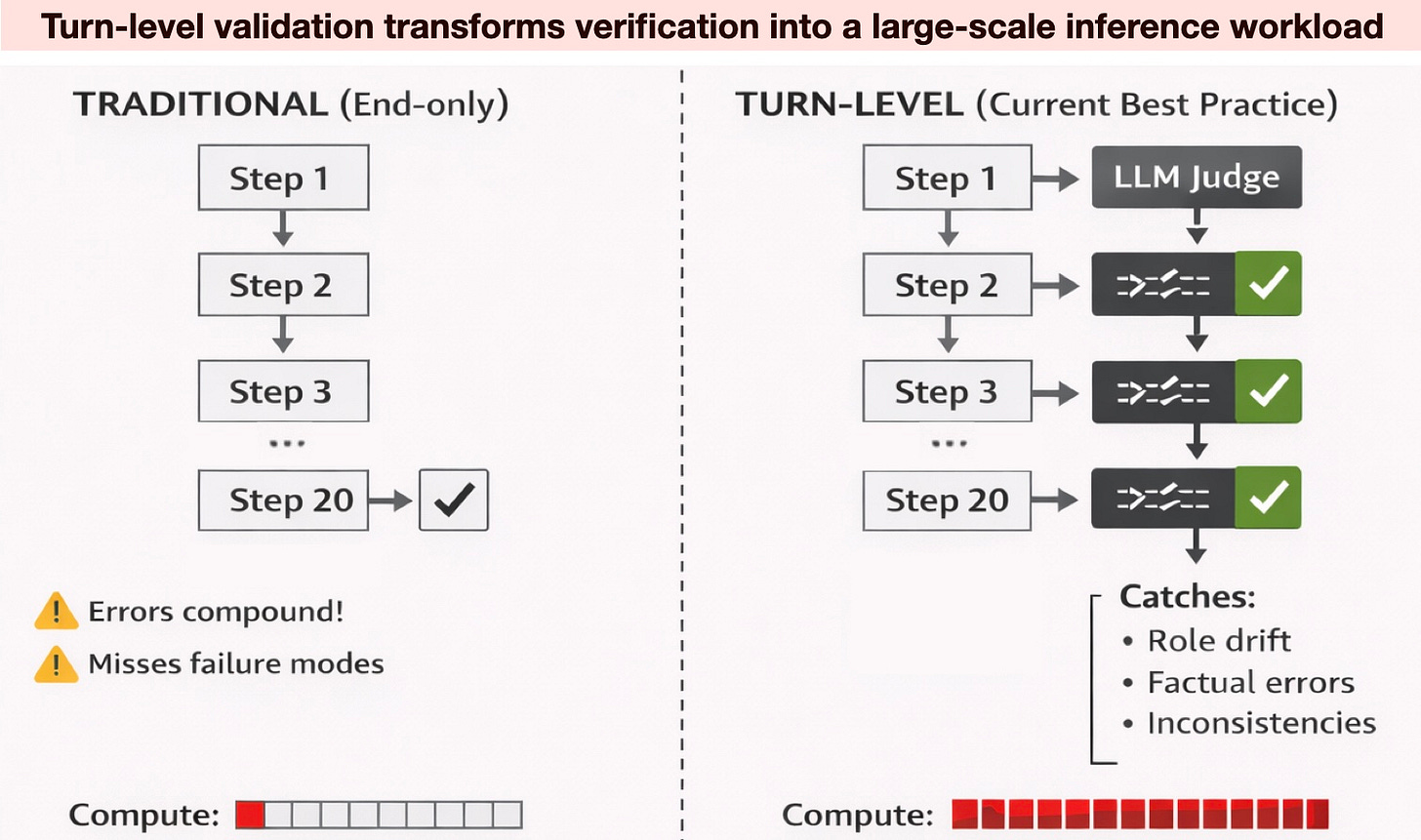 Because these sequences can be long, checking the work is no longer a simple final check. A tiny mistake at the start of a plan makes everything that follows a waste of time. To catch these errors, teams now use a second AI to judge every single step the first one takes. If a task has twenty steps, you might run fifty separate AI operations just to get one usable result. When you scale that to millions of examples, the demand for processing power explodes.