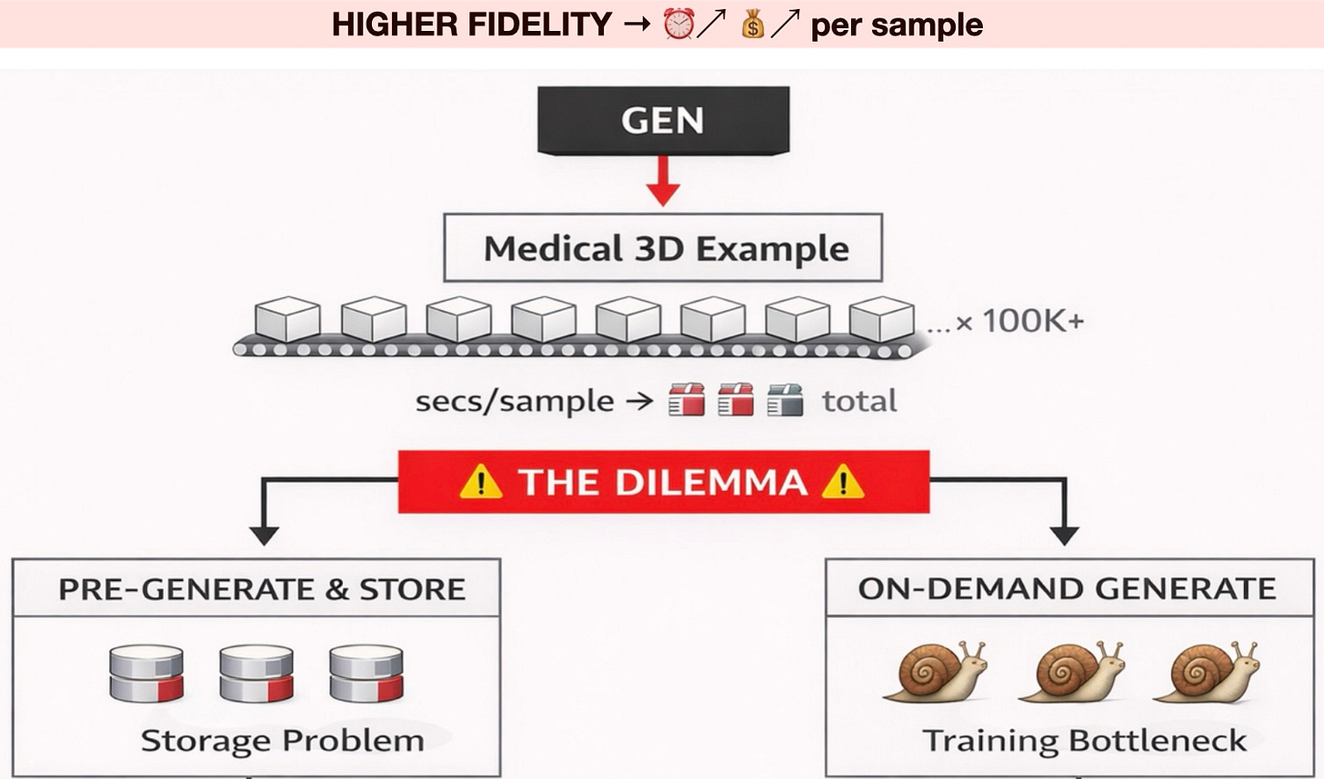 In specialized fields like medical imaging, simple simulations are no longer enough. Generating high-resolution 3D images to train diagnostic AI requires advanced models that are much slower than older methods. Because training loops consume data faster than a single generator can produce it, teams often have to run massive GPU pools just to ensure the training process does not sit idle while waiting for the next batch of images.