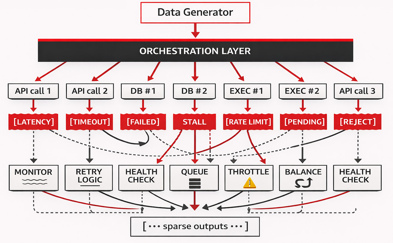 Many pipelines have moved from a single model call per example to a coordinated workflow of different agents. One agent might select a persona, another generates the content, and a third refines the tone. When you multiply this by millions of examples, the total number of inference calls scales rapidly. In practice, teams building research assistants or customer-support agents find that synthetic data generation is actually a complex set of separate inference jobs that require sophisticated scheduling and tracking.