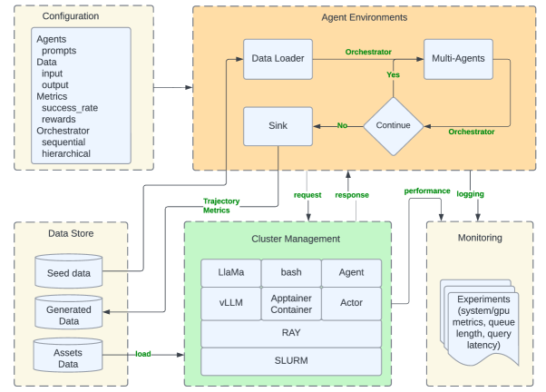 The setup highlights how much infrastructure this requires. Matrix is built on an open-source stack (SLURM and Ray) and uses containerized execution (Apptainer) for tool and environment interaction, while compute-intensive operations like LLM inference and container workloads are handled as distributed services that can scale independently from the agents. In one test, the system handled over 12,000 tasks at once and produced 2 billion tokens of text in about four hours. For tasks that involve using real software tools, it can run 1,500 containers at the same time to verify that the results are accurate.