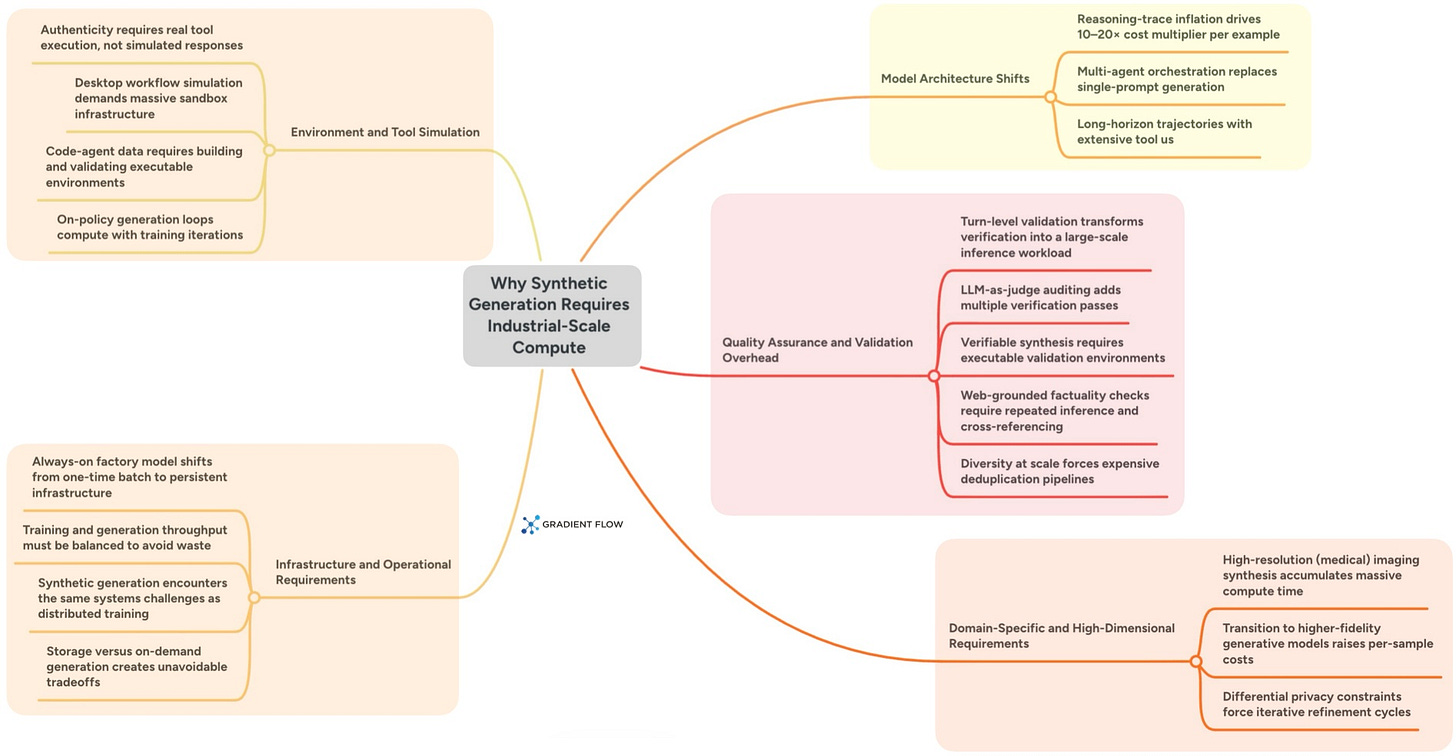 Compute intensive, in this context, means two things. First, the cost per synthetic example is going up because each example is longer, more interactive, and often requires multiple model calls. Second, the pipeline around generation is getting heavier: validation, deduplication, tool execution, sandboxes, storage, and orchestration. This complexity has effectively turned synthetic data generation into an industrial-scale engineering problem.